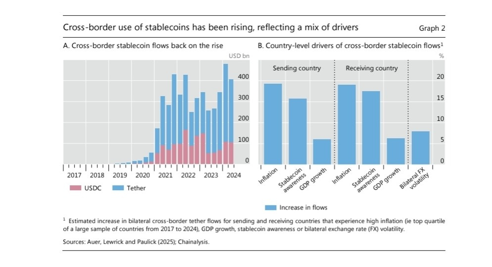 Dollar dominance: Over 99% of stablecoins are USD-pegged, with cross-border flows rising sharply (see Graph 2.A). As Graph 2.B shows, these flows spike in countries experiencing high inflation or FX volatility, making stablecoins a stealth vehicle for dollarisation. This undermines local monetary policy and can erode sovereignty, especially in emerging markets.
