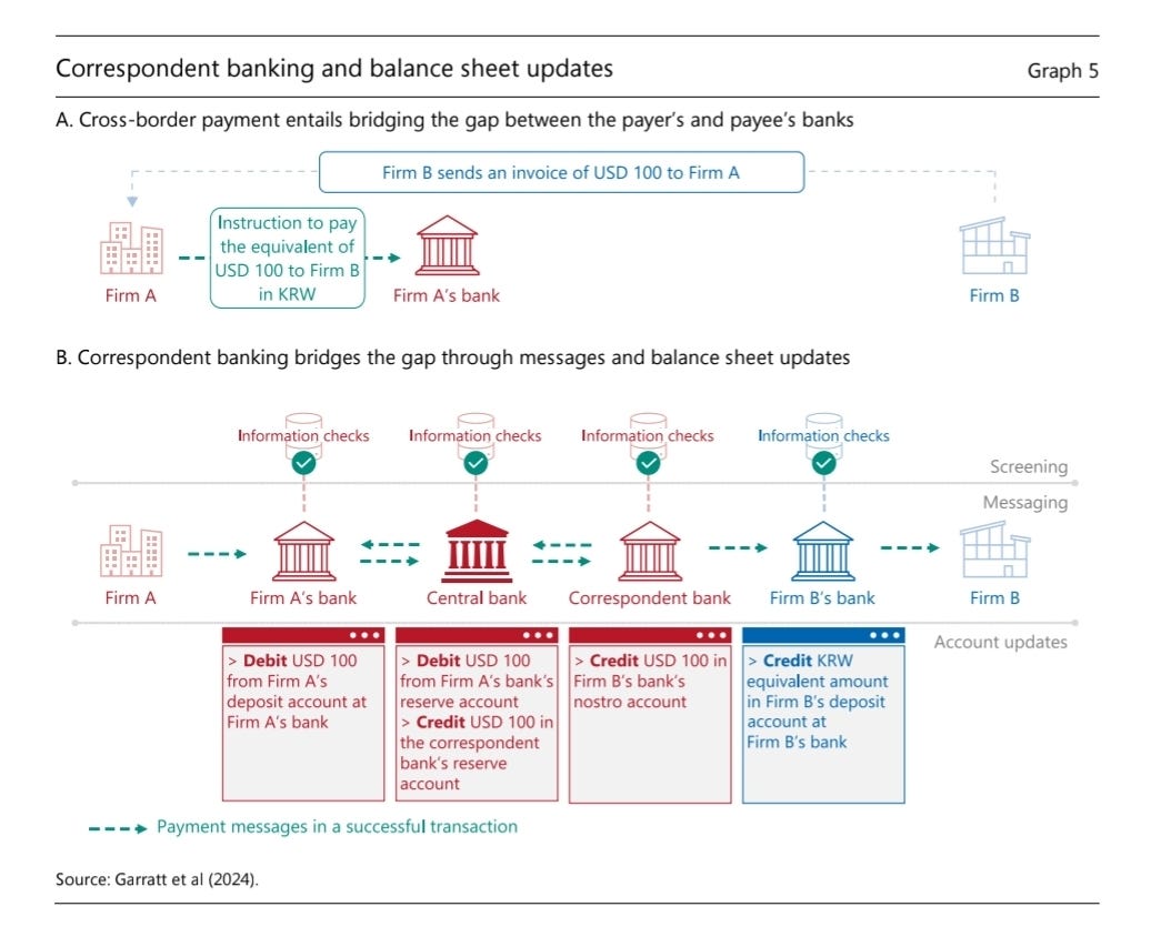 Graph 5.B then unpacks the convoluted reality of a cross-border payment: Firm A in the US paying Firm B in Korea in KRW. Instead of a direct transfer, the USD payment first goes from Firm A’s bank to a US correspondent bank, settling in USD with the Federal Reserve. This correspondent bank then updates its internal ledger (crediting the Korean bank’s USD account), and only then does the Korean bank confirm and convert it to KRW for Firm B. Crucially, no actual money crosses borders; it’s a series of account updates and currency conversions, involving multiple messages and separate settlements. This multi-step process introduces delays, costs, and risks.
