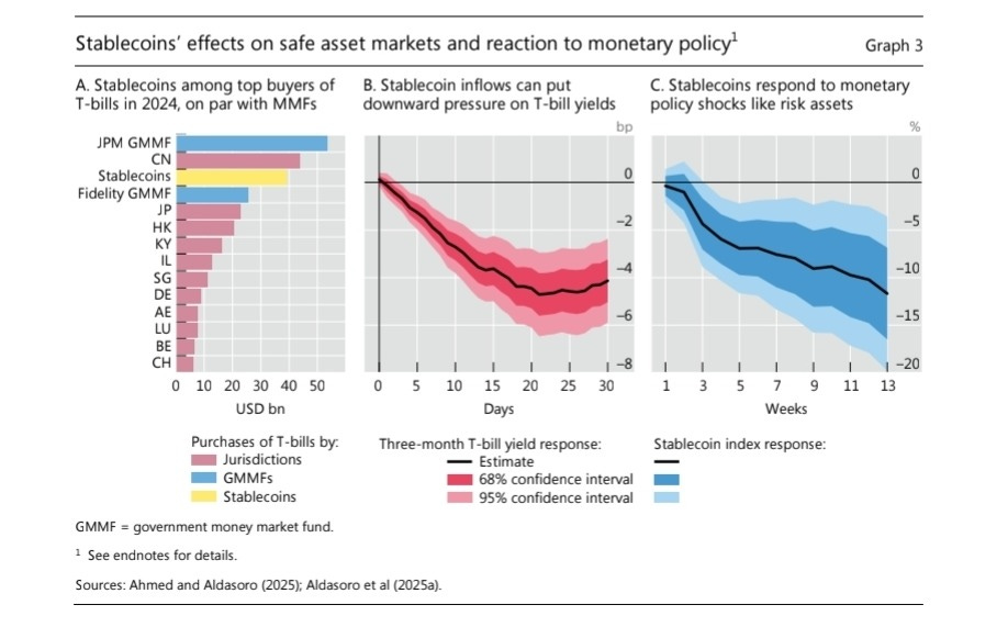 Treasury market footprint: Stablecoins are now among the largest buyers of short-term US Treasuries, rivaling major money market funds (see Graph 3.A). BIS research finds that inflows into stablecoins can lower three-month Treasury yields by 2–2.5 basis points, while outflows can raise yields by 6–8 basis points (Graph 3.B and 3.C). This asymmetric effect means that a run on stablecoins could quickly destabilize Treasury markets, amplifying financial shocks.